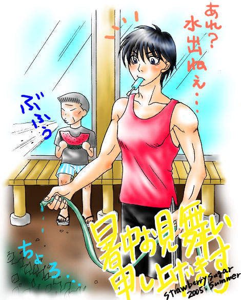 『Strawberry Sugar』の関リョーコさんから頂いてまいりました☆ ああ、今年は私は暑中見舞いイラストが描けなかったというのに...(泣) アイス咥えてる一郎さんもステキですが、後ろで凄い勢いでスイかの種を吐いてる父郎も可愛いです〜vvv 関さん、どうもありがとうございました! 05.7.31