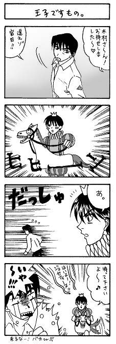 ニアピンを二回も踏んでしまったら、『Strawberry Sugar』の関リョーコさんからニアピン・リクエストとして頂きました。 リクエスト内容は 『キム兄さんと待ち合わせした宮田が、白馬に乗って王子姿で登場。キム兄さんが力いっぱい逃げるって感じの4コマ』 でした。 イメージぴったりのもので感動しました。 結果的に宮田はキム兄さんを捕獲したそうです。 ...哀れ、キム兄さん。 関さん、ありがとうございました。
